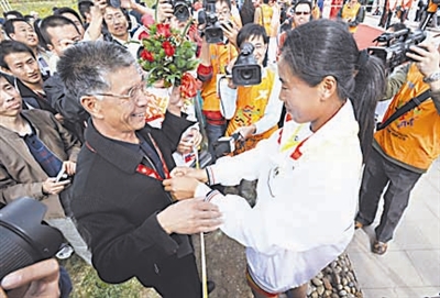 10月19日,在第十一届全运会赛艇女子2000米四人单桨无舵手决赛中,山东队获得冠军。奚爱华(右)将金牌献给到场助威的父亲。 新华社记者 朱峥 摄