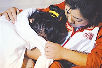 10月19日,李霞(左)在女子举重75公斤级比赛失利后在场外痛哭。