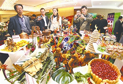 10月20日,参观者驻足观看新疆特色小吃展台。 当日,为期三天的第十届中国美食节暨第八届国际美食博览会在天津开幕。本届美食节以“绿色餐饮、促进消费”为主题,来自全国各地的50多个代表团在展会上制作展出各地美食。