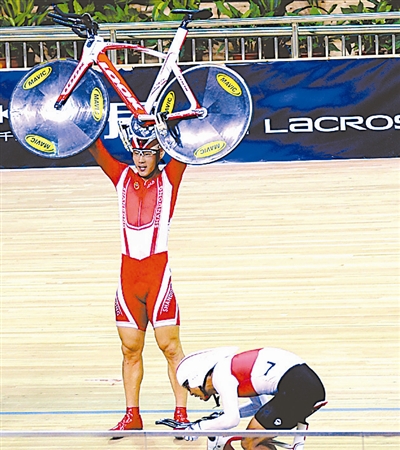 10月20日,山东队队员李传民举起自行车庆祝胜利。当日,在第十一届全国运动会自行车男子场地团体追逐赛决赛中,山东队以4分07秒507的成绩夺得冠军。