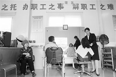 10月20日,在武汉市青山区困难职工帮扶中心,下岗职工潘秋桂正在为周围的居民理发。2008年,青山区总筹资将职工维权中心扩建成困难职工帮扶中心,家庭生活困难的潘秋桂在这里找到了工作。目前,青山区总在全区建立了36个爱心超市,58个爱心学校,为困难职工搭建了一个充满阳光的爱心平台。