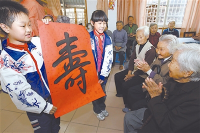 10月22日,江苏省苏州市善耕实验小学的学生将签有学生姓名的“寿”字送给老人。当日,善耕实验小学的学生代表来到苏州虎丘敬老院,向老人们赠送礼物并表演精彩节目,祝老人们重阳节快乐。新华社发(张健 摄)
