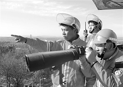 10月18日,森防队员正在瞭望塔上对管护区森林进行观测。黑龙江省八五二农场工会组织在秋防工作中,全力配合宝清林业局、迎春林业局的消防部门抓好对40多万亩林区火源的高压控制。对人员密集的地区和“高危”部位,组织职工加大巡逻密度。同时还制订出了几套灭火预案,确保八五二农场实现连续29年无火灾。
