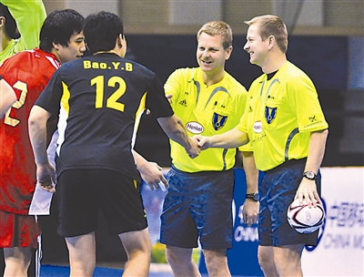 这对来自德国的双胞胎留着相同的小胡子和发型,执法时又穿着统一的黄色裁判服,在40米长的手球场上来回跑动,实在难以分辨。 这对德国手球裁判是本届全运会邀请的58名外籍裁判中的两人。新华社记者 张善臣 摄