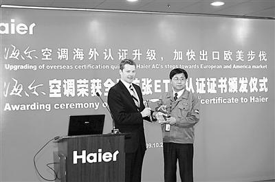 本报讯 由著名发明家爱迪生参与创始、总部位于伦敦的全球最大检测认证机构Intertek,日前,派出商用及电子电气全球总裁来到海尔,为海尔空调送来了一份特殊的礼物——全球第001号ETLEU认证证书。这不仅标志着海尔空调在产品质量、安全、能效水平、质保体系等方面的综合实力已处于全球领先地位,更意味着其出口欧美国际市场步伐将提速。