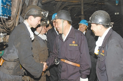 节日期间,黑龙江省总工会主席王悦华(中)率领工会干部深入井下慰问一线采煤工人。