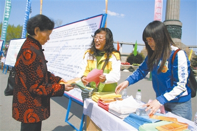 法制宣传日,黑龙江省总工会工作人员走上街头向群众发放宣传资料。