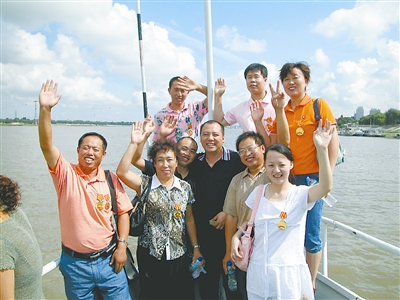 在工会组织的精心安排下,在哈尔滨务工的农民工劳模喜游松花江。