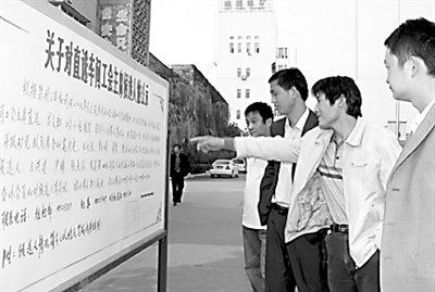 “这不是咱班班长张长伟吗?”“原来他也参加工会主席竞选了!”10月15日,安徽淮北矿业桃园煤矿综掘二区挂出“直选车间工会主席候选人公示牌”,机电班的职工们边看边议论。该矿在不断推进工会组织群众化、民主化、法制化建设进程中,积极推行基层车间工会主席直选,谁做工会当家人,由班组职工说了算!该举措让职工又多了一个成长的阶梯。 孔 军 摄