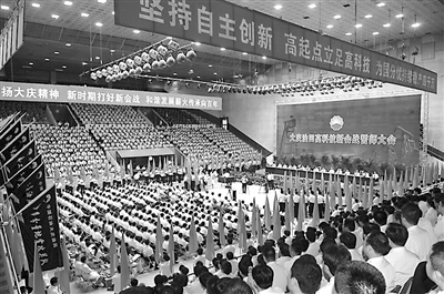2008年,大庆油田全面打响新时期高科技新会战,为原油4000万吨持续稳产提供强有力的技术支撑,图为誓师大会会场。