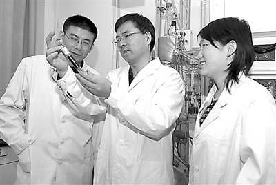 大庆油田科技人员发扬超越权威、超越前人、超越自我的“三超”精神,勇担重任,刻苦攻关,图为技术人员精心录取每一个试验数据。
