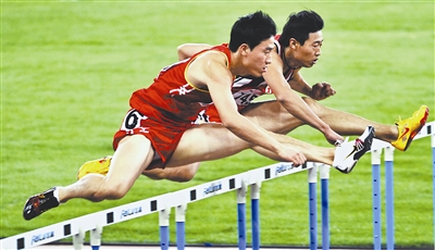 10月24日,在第十一届全国运动会田径男子110米栏预赛中,刘翔以小组第二的成绩晋级决赛。本报记者 许之丰 摄