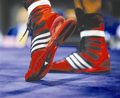 10月24日,拳击运动员韩磊的鞋在比赛中出现底部脱落。新华社记者 杨光 摄