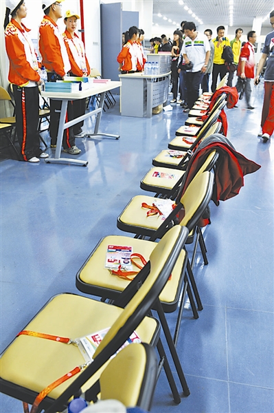 10月24日中午,全运会田径赛场记者工作室内,早早在此等待换取场内拍摄背心的记者们搬出一排椅子帮着排队。刘翔在全运会的首场比赛当天晚上8点举行。本报记者 许之丰 摄