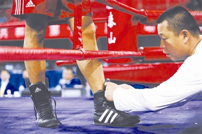 10月24日,拳击运动员孟繁龙(左)的鞋带在比赛中开了,场下教练员给他系鞋带。
