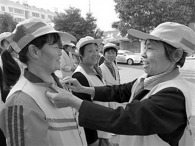 10月26日是浙江省第13个环卫工人节。节日前夕,龙游县县领导和县建设局负责人看望慰问了工作在一线的300多名环卫工人,为辛勤劳动的“城市美容师”送去节日的问候。图为环卫职工们满怀欢欣地在相互整理新装,准备上岗。 方胜祥 吴志雄 夏文艺 摄