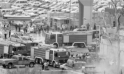 10月25日,消防车辆和伊拉克军警赶到伊拉克首都巴格达省政府大楼前的爆炸现场救援。