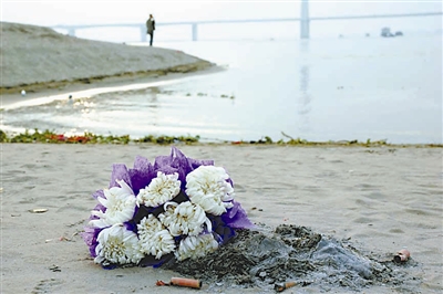 10月26日,江滩边摆放的鲜花寄托着人们对年轻英雄的怀念。新华社记者 魏梦佳 摄