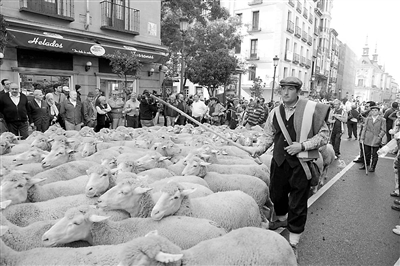 10月25日,几名牧民赶着绵羊穿过西班牙首都马德里城区。当天,牧羊人驱赶着300多只绵羊穿过马德里闹市区,希望引起政府对牧业的重视,要求古老的游牧路线得到保护。