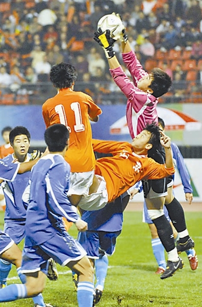 10月26日晚,在山东省中心体育场举行的男子足球乙组决赛中,山东队轻松地以4比1战胜陕西队。图为陕西队门前的混战。本报记者 许之丰 摄