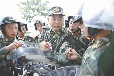 江鹰(中)到基层中队听取官兵对防暴器材的改进意见。刘海山 唐占军 摄