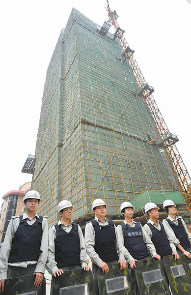 10月27日,城管队员在楼下值勤,维持秩序,准备强拆湖北省供销仓储运输总公司兴建的违规经济适用房,涉及违建3966平方米。当日强拆三层,其余违建要求自拆。违建若全部拆除,约损失500万元。按照武汉经济适用房今年最高限价2950元/平方米推算,违建部分可卖1100多万元。许多市民发问:为何违章建筑这么久才发现,这样的损失谁来承担?汉友 摄