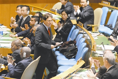 10月28日,在美国纽约联合国总部,参加联大会议的代表在古巴外长罗德里格斯(站立者)发言后鼓掌。当日,第64届联合国大会以压倒性多数通过决议,敦促美国结束对古巴的封锁。这是联大连续第18年通过此类决议。