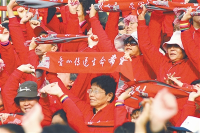 近日,由中国医学科学院肿瘤医院主办,加拿大驻华使馆、中国癌症基金会等多家单位协办的第十一届北京希望马拉松为癌症防治研究募捐义跑活动在朝阳公园礼花广场鸣枪起跑。北京各大高校、企事业单位、国际友人、医务工作者、抗癌明星和爱心市民组成千人方阵一起为爱起跑,一同用爱心传递生命的希望。活动当天有近100家企事业单位进行了捐款,善款超过100万元。左图为参加希望马拉松募捐义跑的爱心市民集体做义跑前的热身。