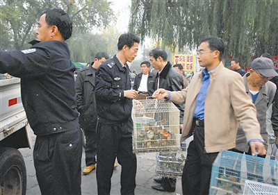 河北省秦皇岛市森林公安干警在清查鸟类市场(10月24日摄)。