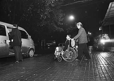 图为办证残疾人在老人的帮助下披星戴月去百里外县城体检的情形。