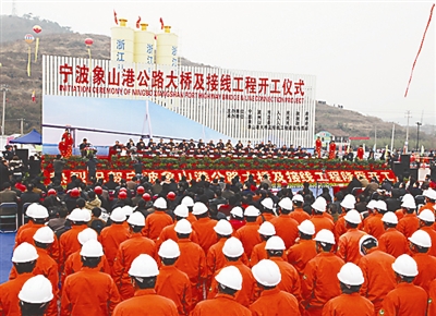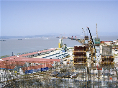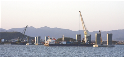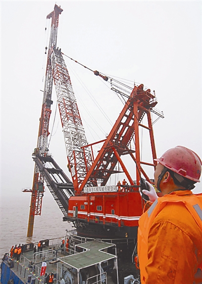 象山港公路大桥长达89.6米的第一根桩(试验桩)被缓缓打入海中