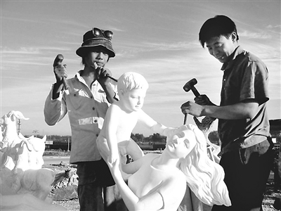 曲阳县政府今年将数十家农民创办的雕刻企业联合起来,对外承揽大型雕刻工程,并使产品远销80多个国家和地区,解决了5万余名农民工在金融危机时期离土不离乡的就业问题。图为曲阳县农民工在精心雕刻石像产品