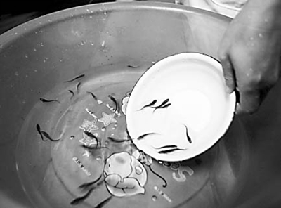 11月3日,中华鲟繁殖研究人员在清点中华鲟幼鲟数量。当日,中国长江三峡集团公司中华鲟研究所首批全人工繁殖的中华鲟幼鲟满月,这批幼鲟长约7厘米。根据幼鲟的生长发育需要,研究所研究人员将幼鲟从三峡坝区基地的养箱内转移到黄柏河繁殖基地放养,待达到放流条件后再放入长江。