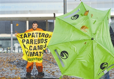 11月5日,在西班牙巴塞罗那举行的2009年联合国第五次气候变化谈判的会场外,绿色和平组织成员模拟“风雨交加”的恶劣天气效果,揭示气候变化给人类生存环境带来的灾难性破坏,呼吁发达国家为解决气候变化问题迅速采取实际行动。