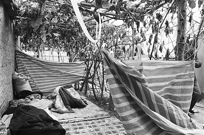 10月初,河南农民工老戴来到了位于北京郊区的某工程队,由于帐篷已经住满,在近一个月的时间里,老戴和几名工友就临时睡在了葫芦架下的地铺上。本报记者 罗娟 摄