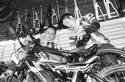 河南省南阳市卧龙区的大学生张温良(右),毕业后走自主创业之路,经过考察论证开办了一家越野自行车俱乐部。由于服务周到热情,组织的各项活动新颖别致,俱乐部受到健身一族的推崇,目前已经吸纳了2000多名会员。付海厚 摄