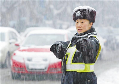 11月12日,在济南市经七纬二路口,济南市公安局交警支队市中大队女子中队民警黄雷冒雪疏导交通。当日,受寒潮影响,一场大雪降落泉城济南。大雪的到来,给市民出行和道路行车带来了不便,个别路段出现了堵塞,济南交警为保道路畅通全员上岗雪中疏通车辆。据济南市气象台预计,这场大雪将是五年来济南地区最强降雪。 袁鹏 摄