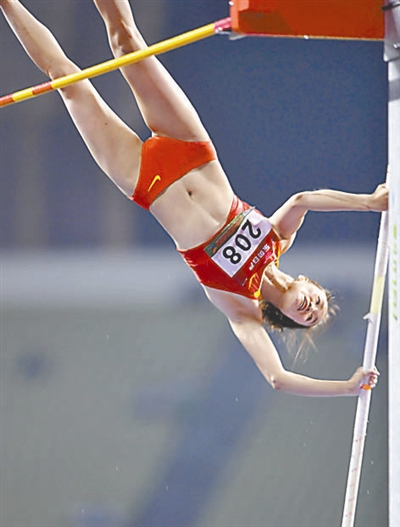 11月12日,中国选手李彩霞在比赛中。当日,在广州进行的第18届亚洲田径锦标赛女子撑杆跳高决赛中,李彩霞以4米30的成绩获得冠军。