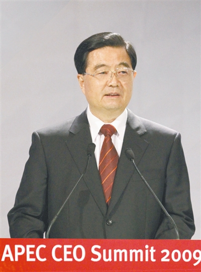 11月13日,国家主席胡锦涛在新加坡出席2009年亚太经合组织工商领导人峰会,并发表题为《坚定合作信心 振兴世界经济》的重要演讲。 新华社记者 鞠鹏 摄