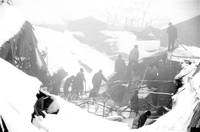 11月13日,河北邢台被暴雪压垮的果品市场,工人正在清理现场。