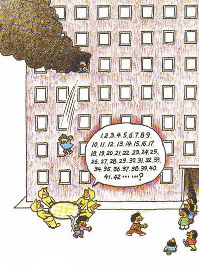 这天,火情突发于一座大楼。那心急火燎的消防队员们赶到现场后,匆匆将“防摔布”扯开,随后高喊楼上小朋友们排队,按秩序一个一个往下跳……要知道,那班上42个孩子,是消防队员早就统计过的。他们倘若“一五一十”地往下数,便不至于落下哪位。没料算术极好的那位消防员,在数到“42”时傻了眼:楼上分明还有孩子欲跳将下来……