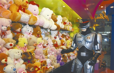 11月13日,在菲律宾奎松城一座商城举行的反犯罪宣传活动中,一名工作人员装扮成警方的吉祥物——“机器警察”来到一家玩具店。