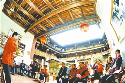 11月13日,来自新加坡的游客在福建省永定县湖坑土楼——庆成楼内观看艺人表演 。