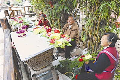 ②在盛产鲜花的古镇花2元钱就可以买一个花环。本报记者 张宪 摄