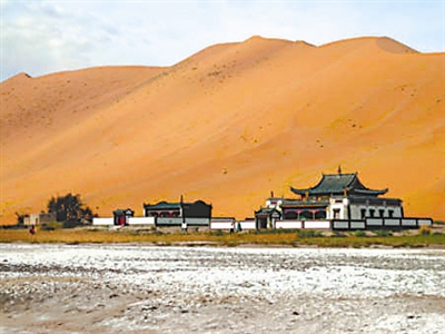 庙海子蒙语称为苏敏吉林,意思是“有庙的海子”。海子边有座藏传佛教寺庙,建于1755年。这座白墙金顶汉藏混合的建筑背靠沙山,面朝湖水,庄严肃穆,幽静典雅,被称为“沙漠故宫”,是巴丹吉林沙漠的地标,亦是牧民心目中神圣的殿堂。