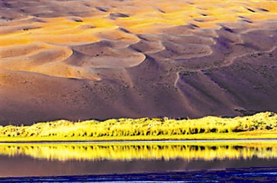 巴丹吉林沙漠由众多的沙山和沙间湖泊相伴组成。沙山高大雄伟,湖水晶莹湛蓝,这种独特的沙漠景观堪称是沙漠中的极品,在世界上也是独有的。
