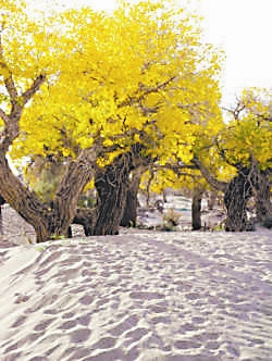 还没等弄清楚被黄沙环抱的蓝水从何而来,又流向哪里,越野车又继续在沙浪中翻腾。在连续攀上几座高大的沙峰时司机突然急刹车,游客下车后几乎同时惊叫了起来:车轮前面是深渊,沙山的陡壁几乎是垂直的,渊底是一池蓝如宝石的海子,这就是沙漠中最著名的庙海子了。兴奋代替了害怕,欢呼声又此起彼伏。有大胆游客弃车滑下沙山,随即发出鸣响声。原来,这里的沙山大都属于鸣沙山。