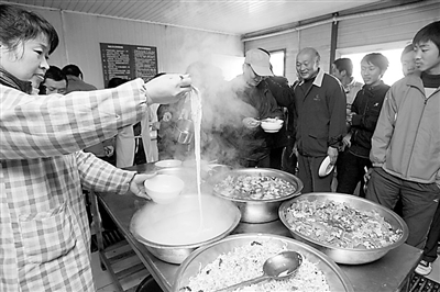 11月11日中午,在北京动车段,下班的工人们正在排队打饭。在此施工的西铁工程公司北京动车段项目部的工人大部分来自陕西,为了照顾大家的口味,该项目部工会定期为大家做陕西特色面食,让大家远在千里之外也能尝到家乡的味道。本报记者 杨登峰摄