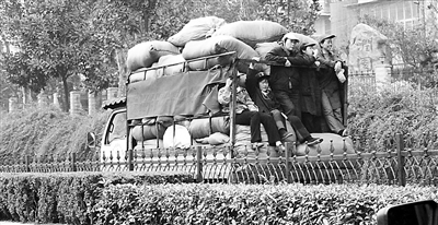 日前,一辆满载货物及乘客的中型货车在武汉市常青路疾驰而过。因为没有为装卸工人留下位置,工人只能挤在货车尾部紧握车上的围杆,才能使自己不至摔落。如此客货混装极不安全,有关部门提醒加强运输车辆管理,保证交通安全!