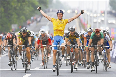 11月16日,俄罗斯选手伯瑞斯·斯皮尔斯基第一个冲过终点。当日,2009年环海南岛国际公路自行车赛进行了第六赛段澄迈至西联农场的比赛。本赛段全程181.4公里,伯瑞斯·斯皮尔斯基获得了该赛段冠军并且以个人总成绩第一和冲刺积分第一蝉联黄衫和绿衫。 新华社记者 郭程摄